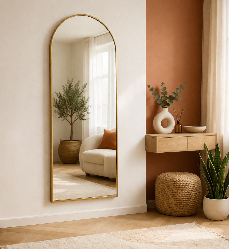 Boogspiegel Kaja is ontworpen voor mensen die een grote spiegel willen die zowel decoratief als functioneel is. Het model past goed in verschillende woonstijlen, van modern en hotel chique tot rustig Scandinavisch of klassiek elegant.