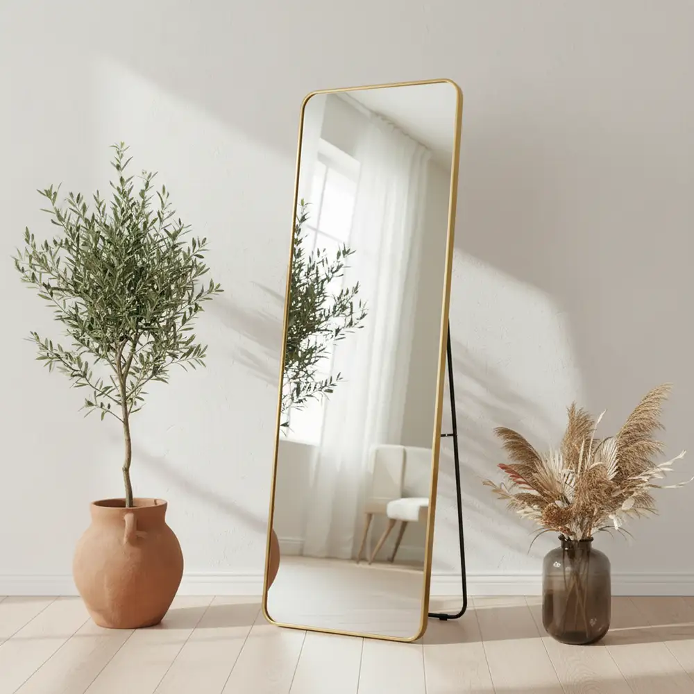 Spiegel Jack in het goud is een slimme combinatie van functionaliteit en uitstraling. Met een formaat van 50x150 cm geeft hij je een volledig beeld van jezelf zonder dat hij veel vloer- of wandruimte inneemt. De metalen omlijsting in warme goudkleur geeft de spiegel een opvallend karakter dat mooi past bij verschillende woonstijlen, van modern tot klassiek. Je kunt Jack op drie manieren gebruiken: losstaand dankzij de geïntegreerde staander, leunend tegen de muur of strak opgehangen. Die flexibiliteit maakt deze spiegel geschikt voor zowel de hal als de slaapkamer, dressing of woonkamer. Jack past zich aan jouw ruimte én stijl aan – en zorgt voor meer licht, ruimtelijkheid en sfeer.