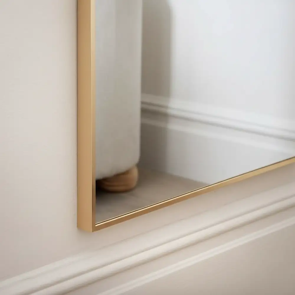 De rechte vorm van deze grote spiegel zwart geeft een rustig lijnenspel aan het interieur. Waar een boogspiegel zachtheid toevoegt, brengt een rechthoekige spiegel juist structuur en helderheid.