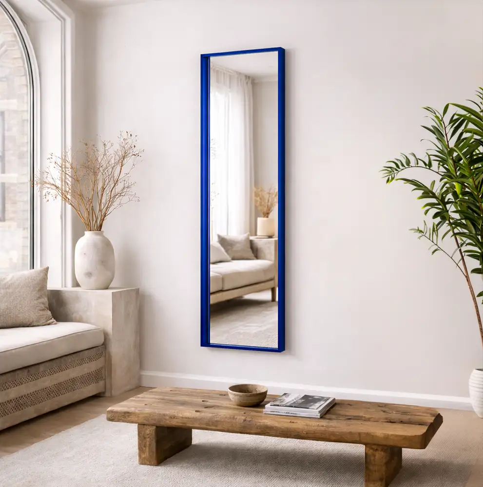 Dankzij het slanke, verticale formaat is deze spiegel ideaal voor ruimtes waar je hoogte wilt creëren: in de hal, slaapkamer of dressing. De blauwe tint zorgt voor een kalme basis, terwijl het strakke ontwerp de spiegel modern en eigentijds houdt.