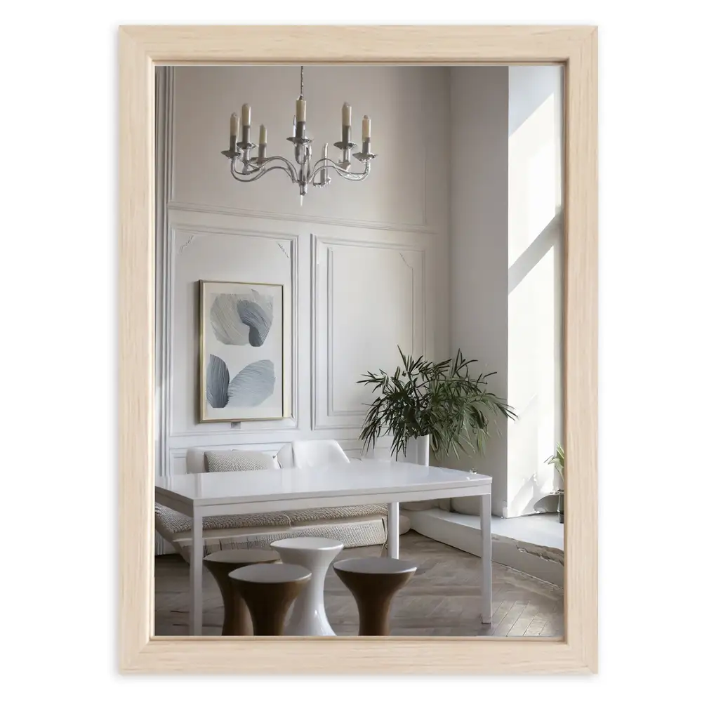 Spiegel Milo Hout is de ideale basic spiegel voor wie houdt van een natuurlijke en frisse sfeer in huis. De licht houten lijst met een profiel van 30x20 mm geeft de spiegel een zachte, warme uitstraling zonder overheersend te zijn. De lijst is strak afgewerkt en wordt geleverd zonder facet, waardoor de spiegel perfect past in minimalistische interieurs of ruimtes met een Scandinavische touch. Dankzij de meegeleverde ophangbeugels kun je de spiegel zowel horizontaal als verticaal aan de muur bevestigen. Praktisch, stijlvol en veelzijdig – Milo Hout is een toegankelijke keuze voor elke ruimte.