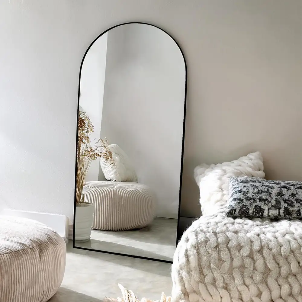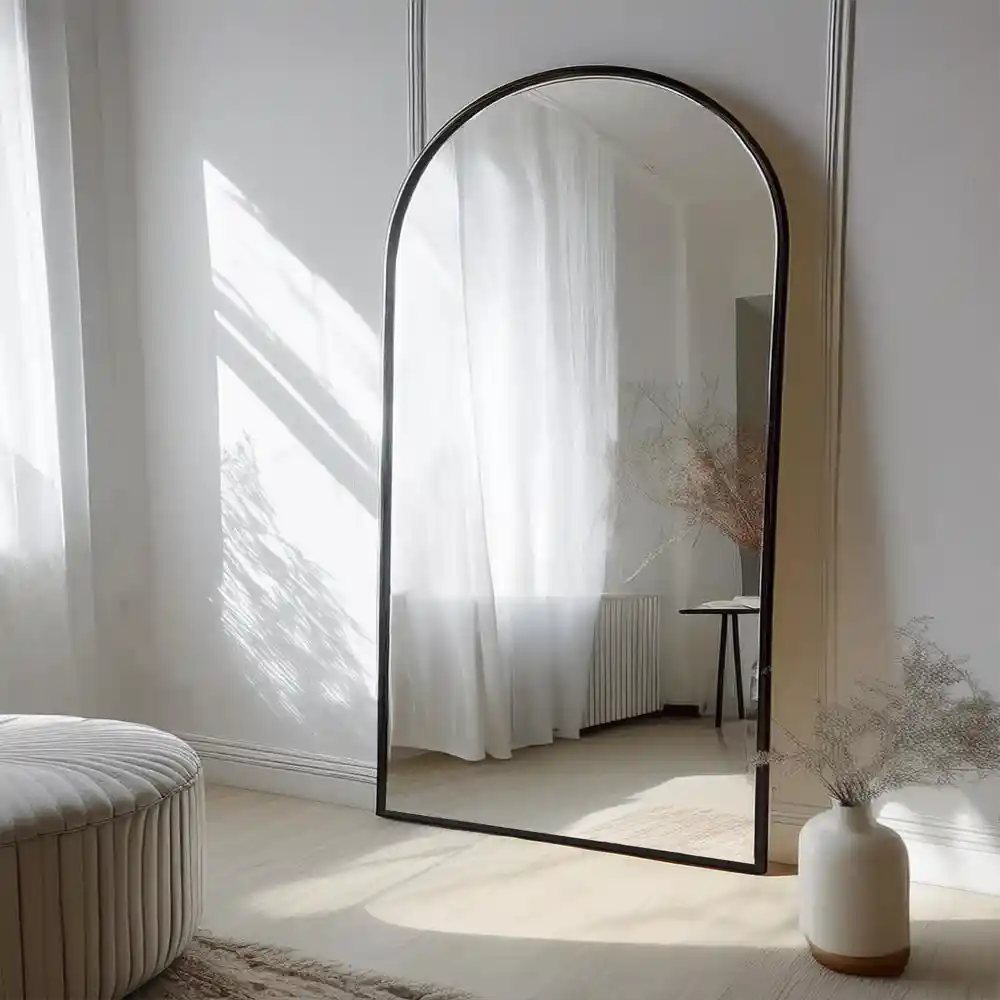 De Ravenna boogspiegel van 100x190 cm is ontworpen voor wie zoekt naar een combinatie van formaat, eenvoud en flexibiliteit. Dankzij zijn hoogte reflecteert hij niet alleen veel licht, maar biedt hij ook een volwaardige spiegelervaring van top tot teen. De afgeronde bovenzijde geeft deze grote spiegel een zachte lijn, waardoor hij opvalt zonder te overheersen in je interieur. Door zijn ronde bovenzijde en rustige uitstraling sluit deze wandspiegel ook goed aan bij stijlen zoals Japandi en Scandinavisch wonen.