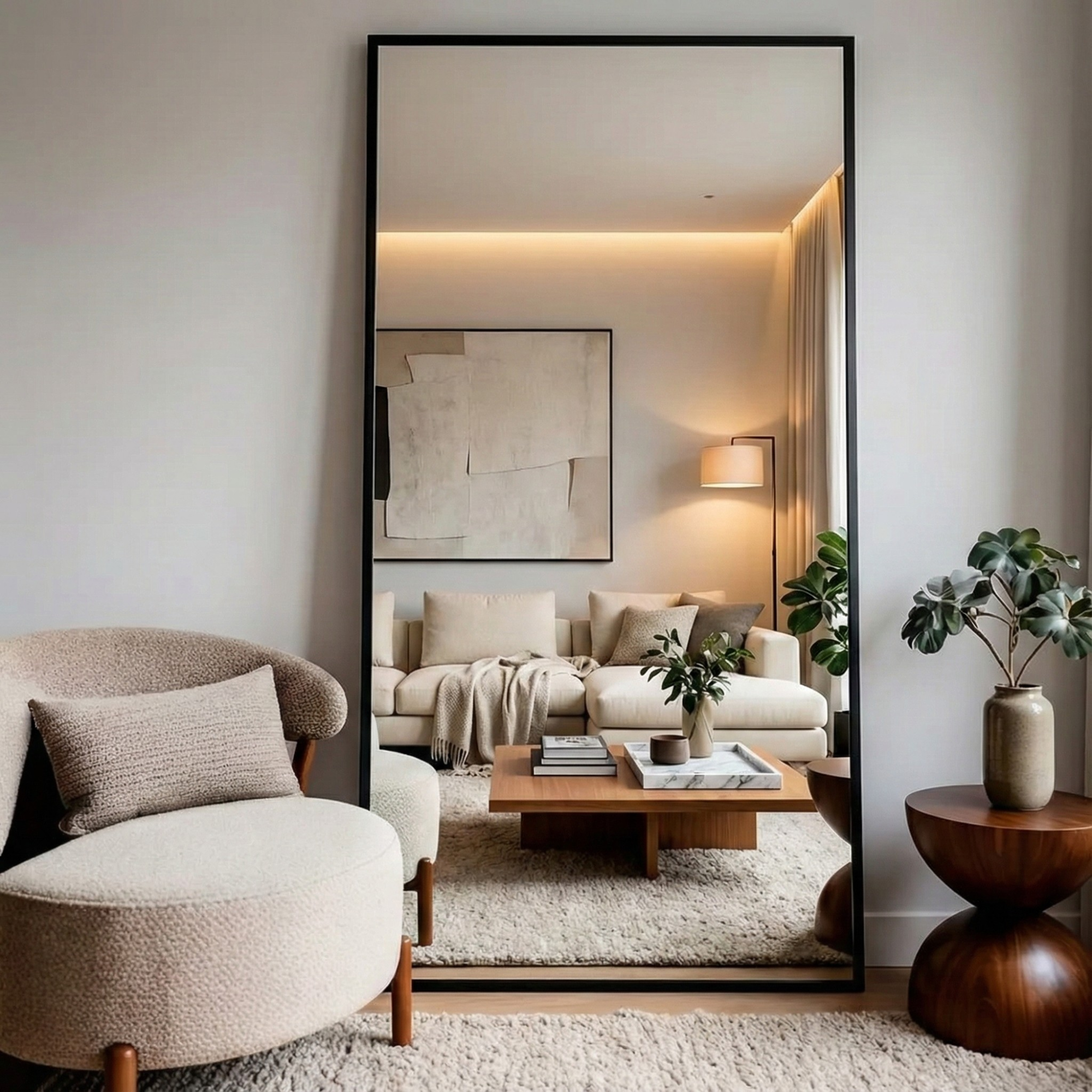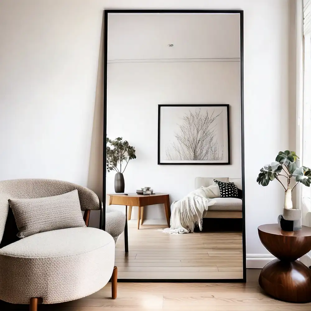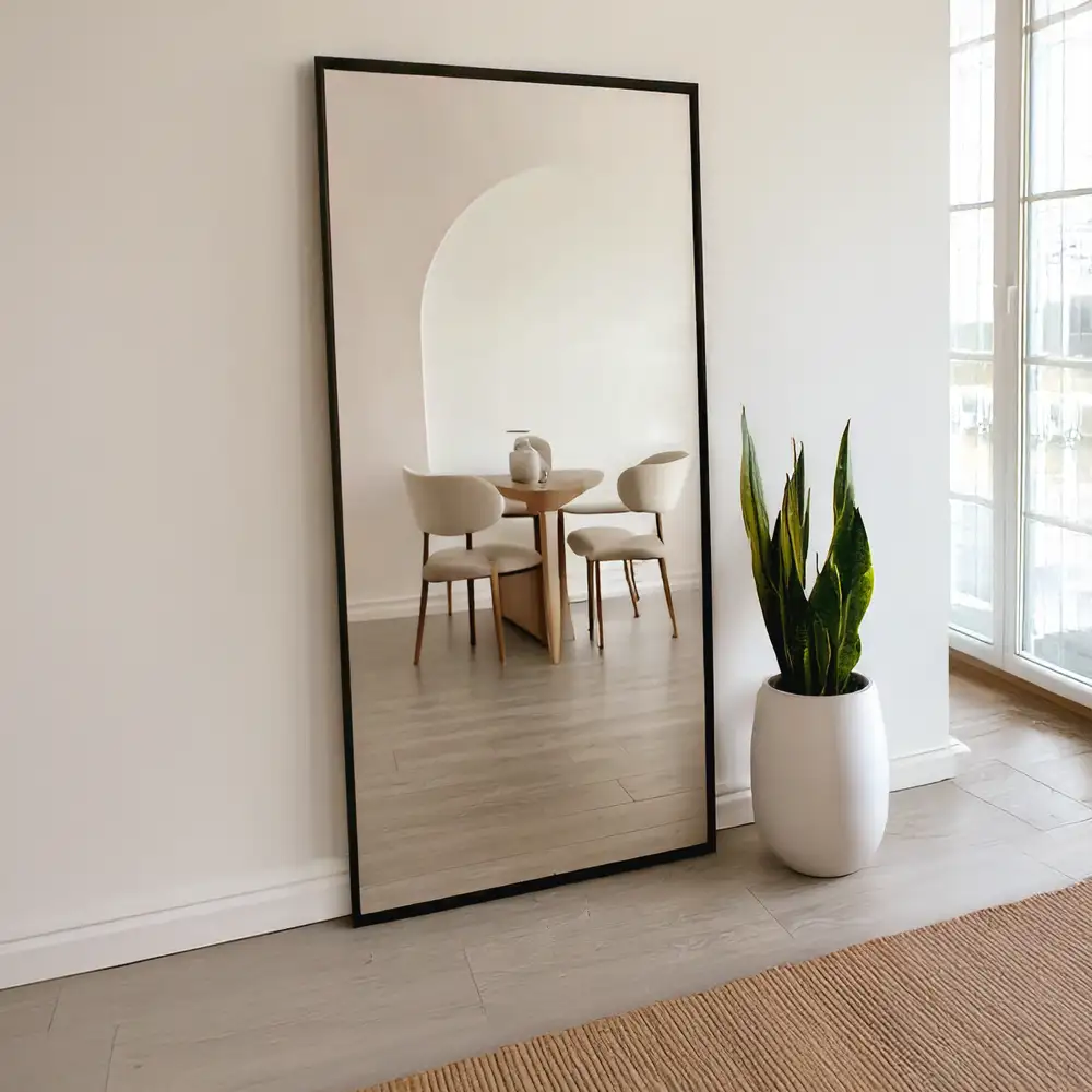 De Olaf passpiegel biedt precies wat je nodig hebt: een compleet beeld van je outfit en tegelijk een optisch ruimere kamer. Vooral in smalle ruimtes of kamers met weinig licht is deze grote spiegel een slimme toevoeging. Door het sobere ontwerp en het slanke, zwarte frame past hij moeiteloos bij de rest van je inrichting. En dankzij de flexibele ophangopties bepaal jij zelf hoe hij het beste tot zijn recht komt.